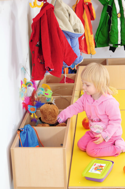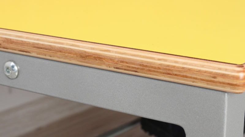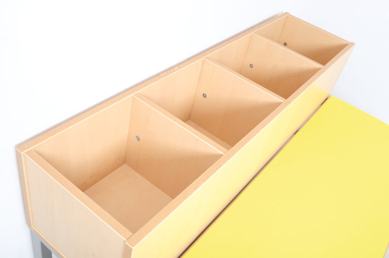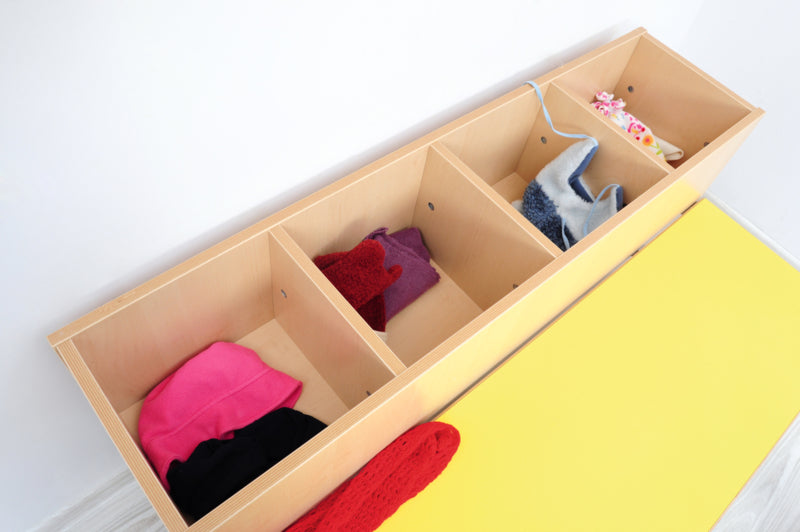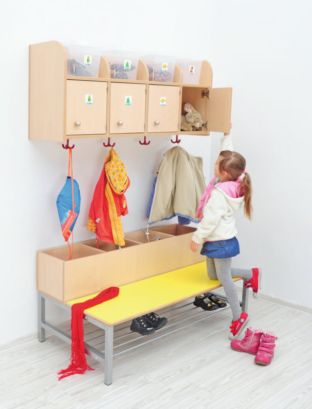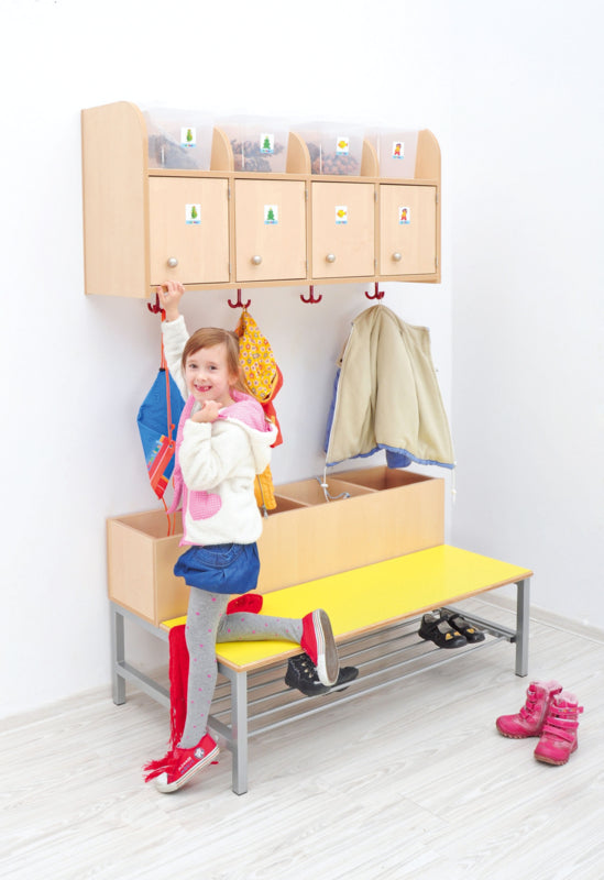 Garderobe bank op een stabiel metalen frame met schoenenrek. Zitting van multiplex met gekleurd HPL laminaat (dikte 19 mm.). Met 2 of 4 compartimenten voor accessoires. Gemaakt van gelamineerd spaanplaat in een berken kleur met ABS rand.