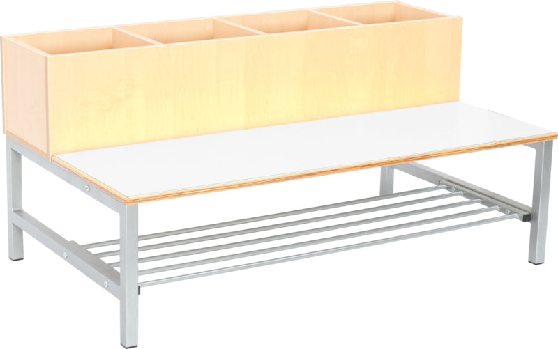 Garderobe bank op een stabiel metalen frame met schoenenrek. Zitting van multiplex met gekleurd HPL laminaat (dikte 19 mm.). Met 2 of 4 compartimenten voor accessoires. Gemaakt van gelamineerd spaanplaat in een berken kleur met ABS rand.