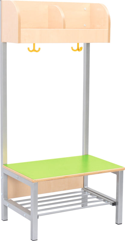 Garderobebank voor 2 kinderen, met een stabiel metalen doorlopend frame, met schoenenrek en garderobeplank..