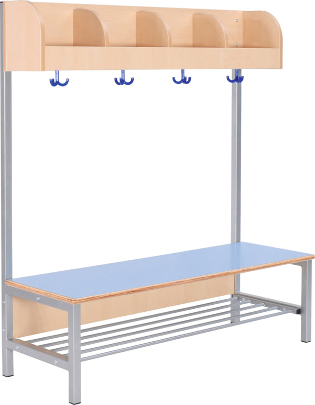 Garderobebank voor 4 kinderen, met een stabiel metalen doorlopend frame, met schoenenrek en garderobeplank..