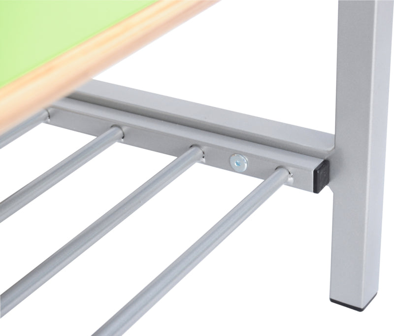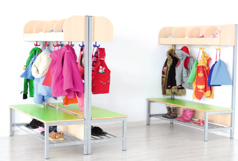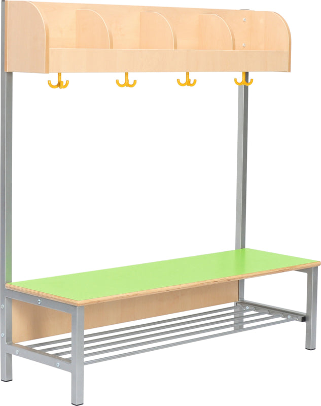 Garderobebank voor 4 kinderen, met een stabiel metalen doorlopend frame, met schoenenrek en garderobeplank..