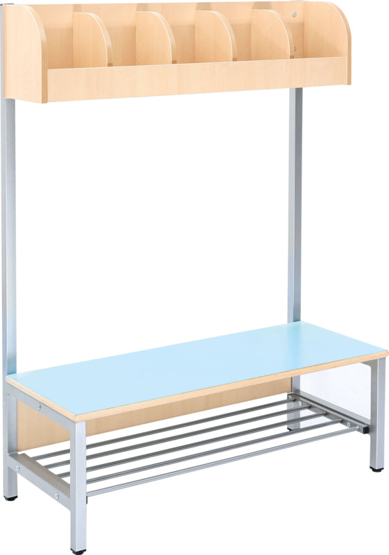 Garderobebank voor 5 kinderen, met een stabiel metalen doorlopend frame, met schoenenrek en garderobeplank..