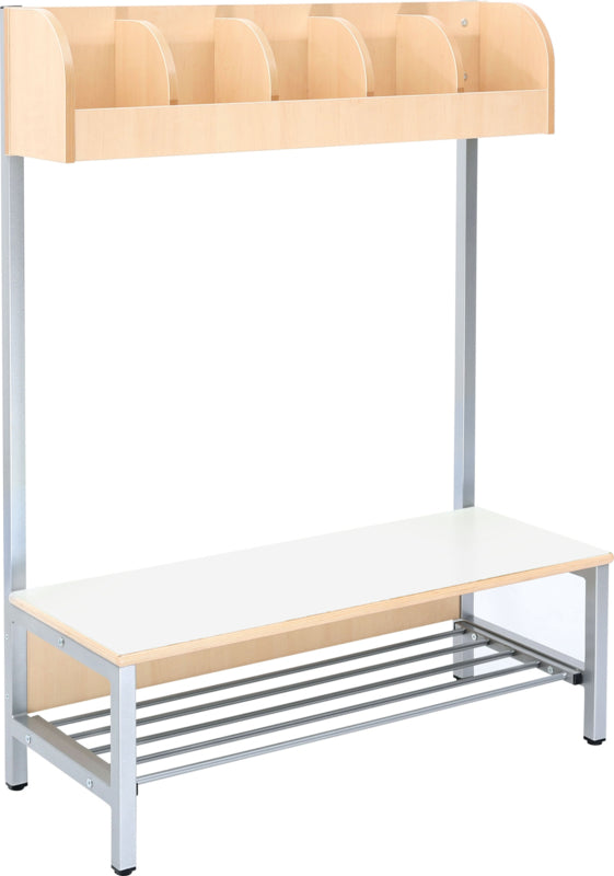 Garderobebank voor 5 kinderen, met een stabiel metalen doorlopend frame, met schoenenrek en garderobeplank..