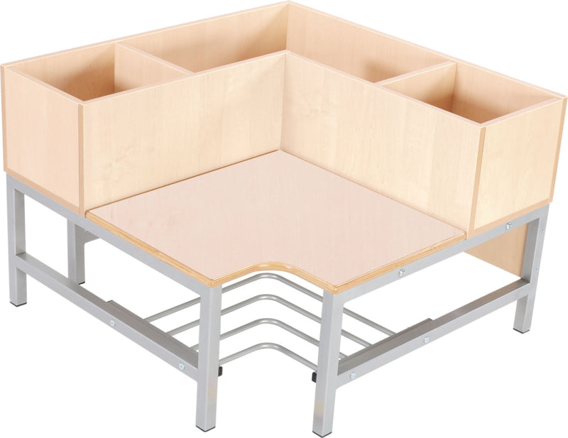 Garderobe hoekbank voor 3 kinderen met een stabiele metalen frame met schoenenrek. Zitting gemaakt van multiplex met gekleurd HPL laminaat. Met 3 vakken voor accessoires in een berken kleur met ABS rand. Leverbaar in 5 kleuren.