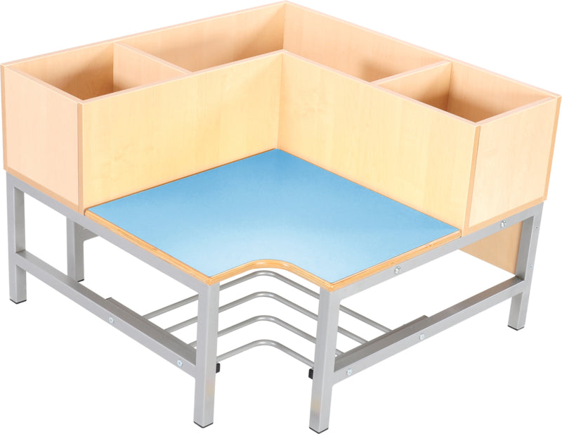 Garderobe hoekbank voor 3 kinderen met een stabiele metalen frame met schoenenrek. Zitting gemaakt van multiplex met gekleurd HPL laminaat. Met 3 vakken voor accessoires in een berken kleur met ABS rand. Leverbaar in 5 kleuren.