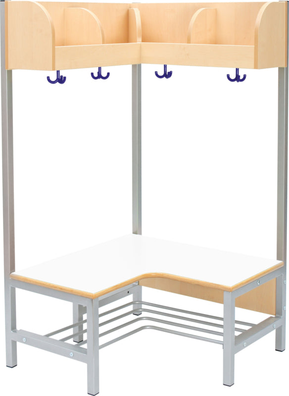 Hoek garderobe voor 4 kinderen, stabiel op metalen frame met schoenenrek. Zitting gemaakt van multiplex, gelamineerd met kleurrijke HPL.