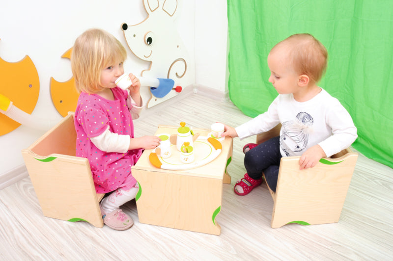 Multifunctionele houten stoel. Kan na omdraaien worden gebruikt als een tafel.