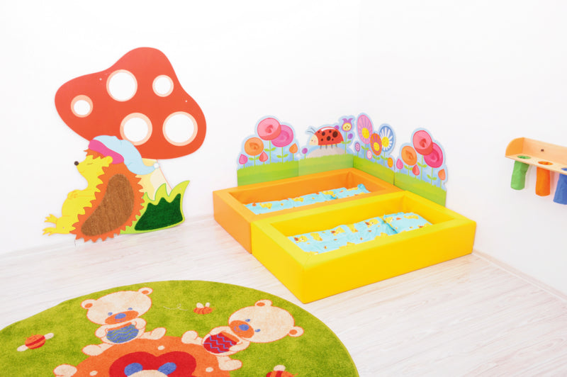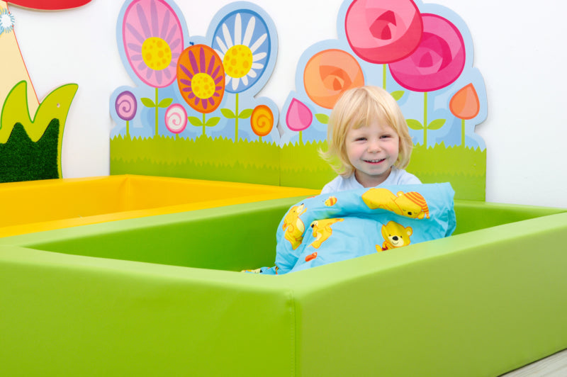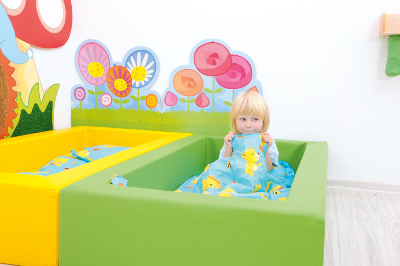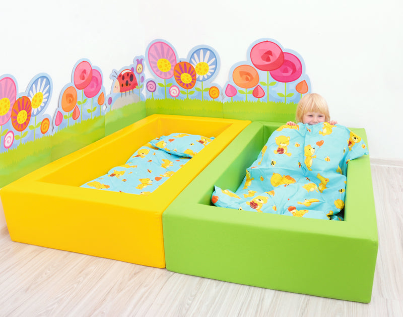- stapelbaar peuterbed gemaakt van schuim bedekt met duurzaam vinyl
