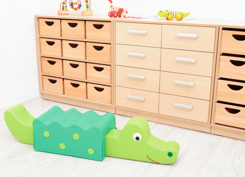 Kleurrijke krokodil gemaakt van een gemakkelijk schoon te maken foam, bedekt met duurzaam vinyl.