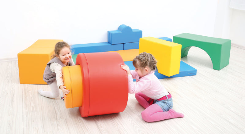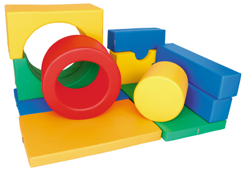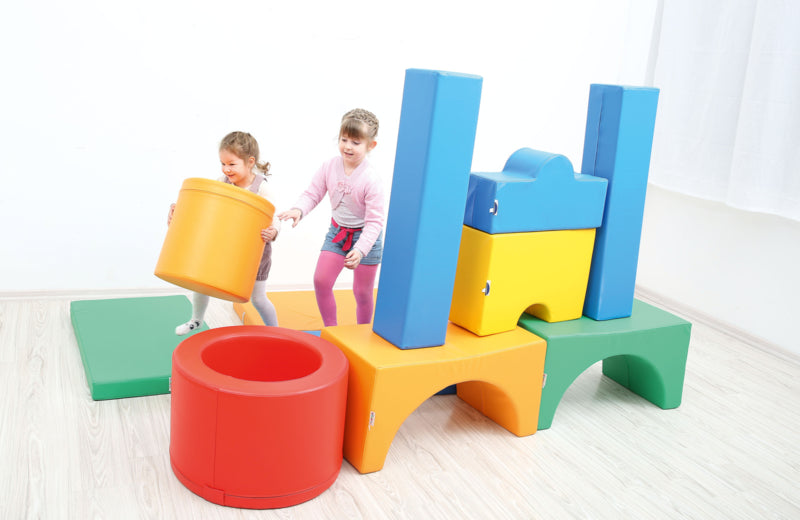 Set foamblokken gemaakt om hindernisbanen voor de jongste kinderen te maken. Ontwikkelt en oefent motorische coördinatie uit. Het is een geweldige plek voor peuters om te spelen. Elementen van verschillende hoogtes en hoeken moedigen aan om te kruipen, klimmen, obstakels te overwinnen enz., Wat een positieve invloed heeft op de algemene ontwikkeling van het kind en op de motoriek.