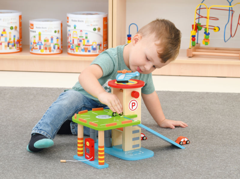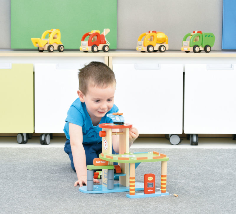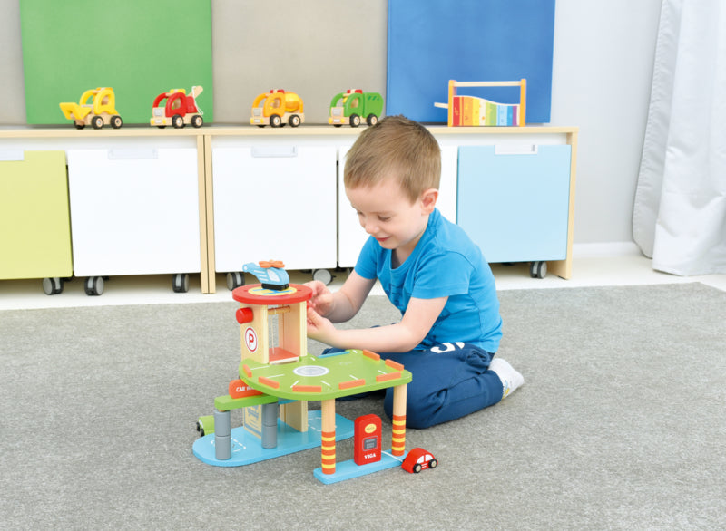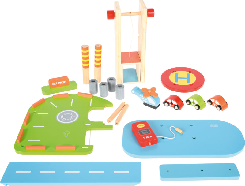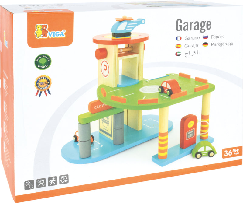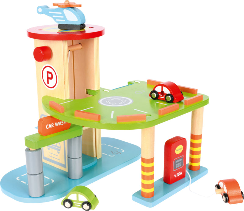 Een houten garage met twee verdiepingen met een scala aan accessoires: een lift, een wasstraat, een pomp en een helikopterplatform op het dak. Bovendien, 3 auto's en een helikopter in de set.