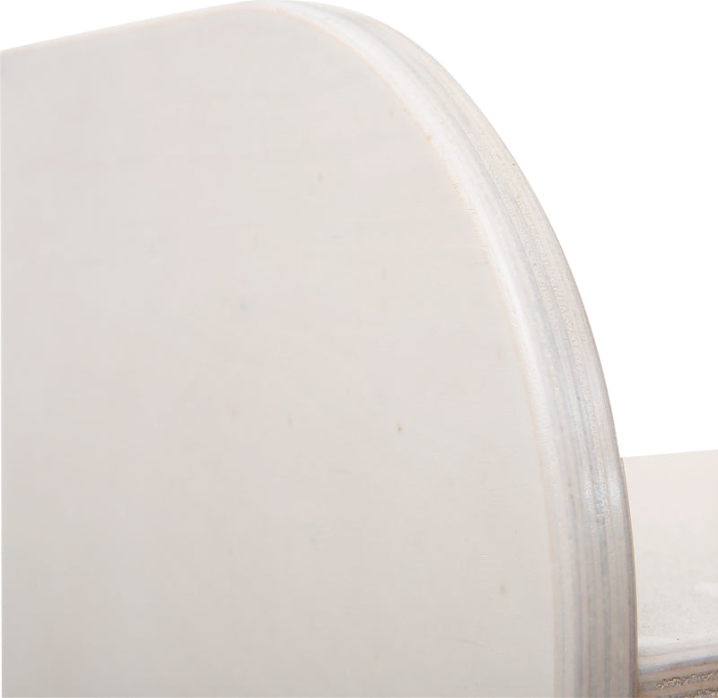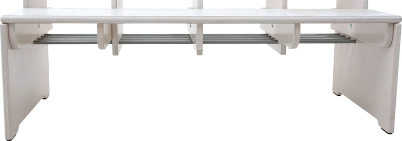Garderobe gemaakt van wit multiplex (dikte 19 mm.). Zitting bekleed met duurzame HPL laminaat. Metalen schoenenrek onder de zitting.