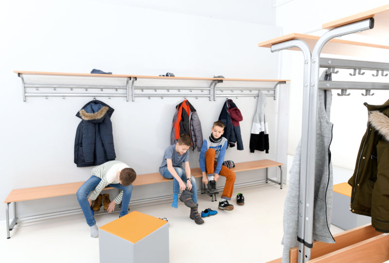 Garderobe hanger gemaakt van platte ovale buis (afm. 38 x 20 mm), in 6 kleuren frame. Plank van gelamineerd spaanplaat in een beuken kleur. Te monteren aan de muur.