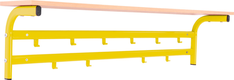 Garderobe hanger gemaakt van platte ovale buis (afm. 38 x 20 mm), in 6 kleuren frame. Plank van gelamineerd spaanplaat in een beuken kleur. Te monteren aan de muur.