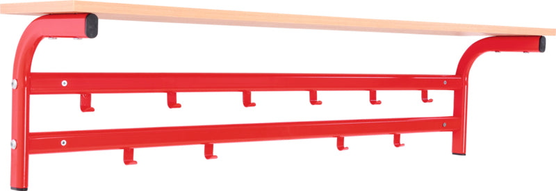 Garderobe hanger gemaakt van platte ovale buis (afm. 38 x 20 mm), in 6 kleuren frame. Plank van gelamineerd spaanplaat in een beuken kleur. Te monteren aan de muur.