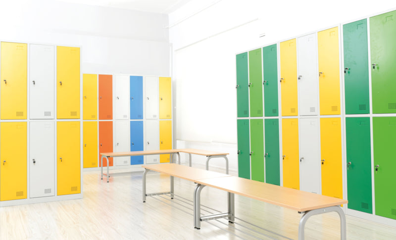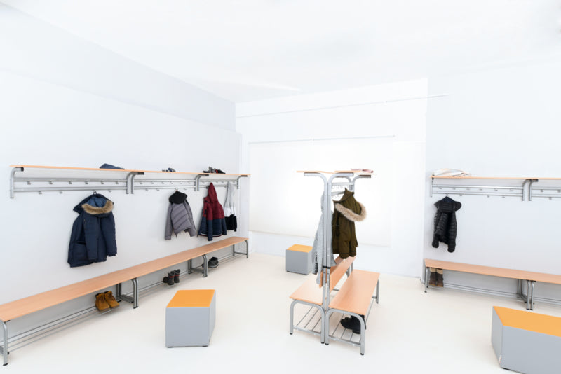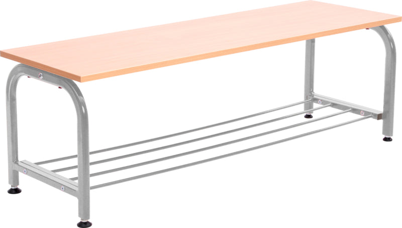 Garderobebank gemaakt van platte ovale buis (afm. 38 x 20 mm), in 6 kleuren frame. Zitting is gemaakt van gelamineerd spaanplaat in een beuken kleur. Bank is uitgerust met niveau-instelpoten.
