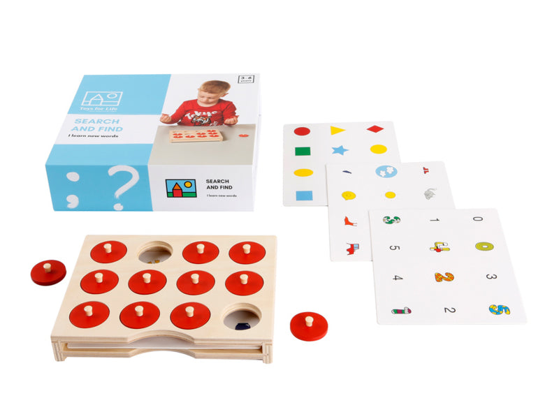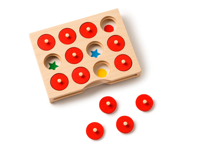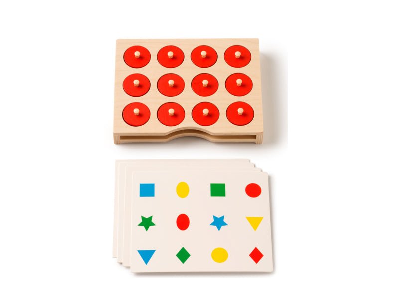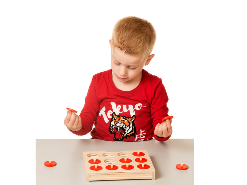 Steek een taakkaart in het houten bord. Pak een rode schijf en beschrijf wat er te zien is: Wie kan de bijbehorende afbeelding onder een andere schijf vinden? Bevordert oog-handcoördinatie, ruimtelijk inzicht en visuele discriminatie.