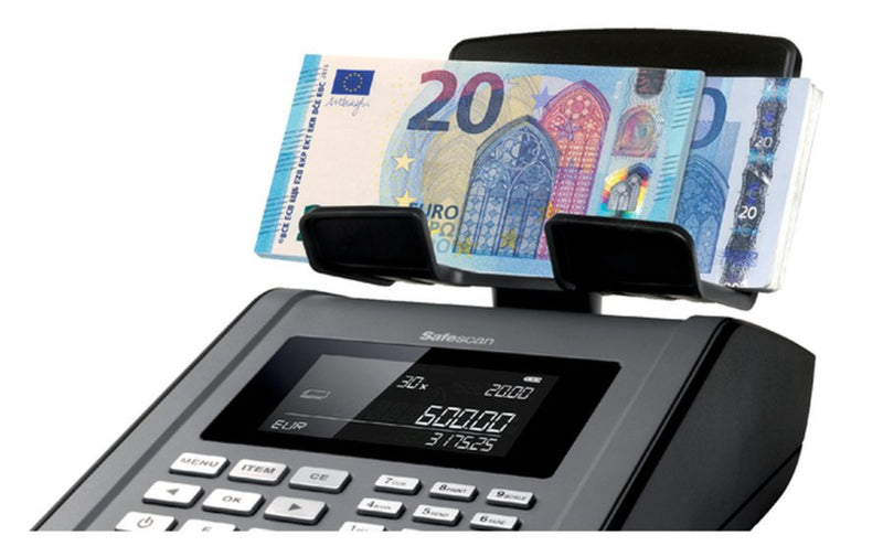 - Telt munten, bankbiljetten, muntrollen/zakjes, bankbiljetbundels/clips/enveloppen, geldwaardes van betaalkaarten en cheques.