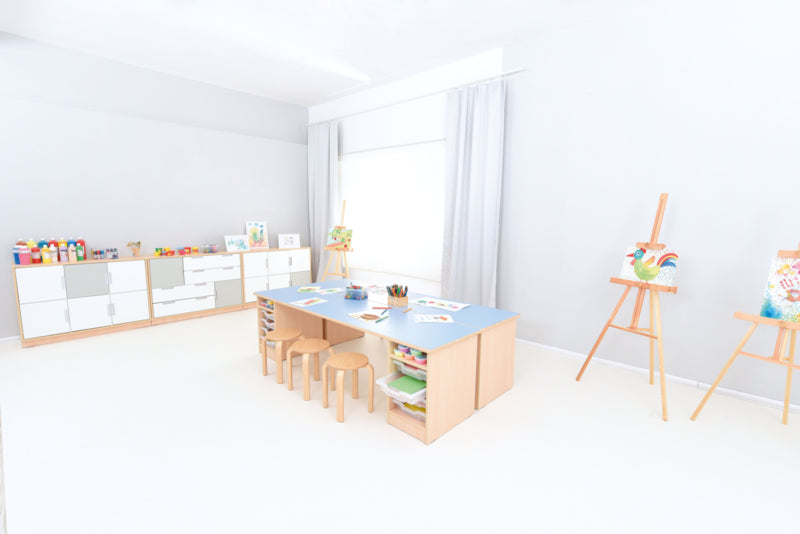Zeer lange tafel met veel werkruimte voor kinderen.