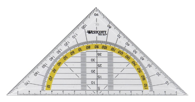 - Transparante kunststof tekendriehoek en geodriehoek met gele inktrand.