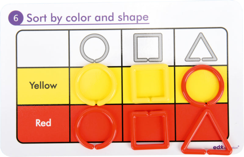 In 3 vormen en 6 kleuren met 20 dubbelzijdige taakkaarten van gelakt karton, afm. 19 x 12 cm.