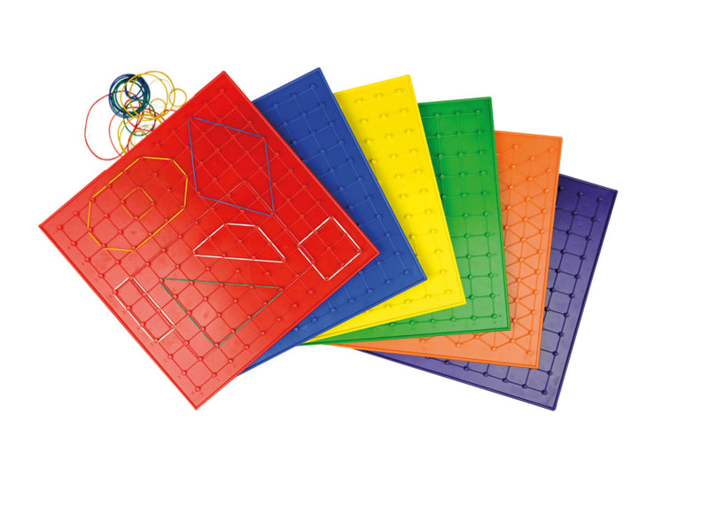 Met de bijgeleverde gekleurde elastiekjes kunnen verschillende geometrische vormen gemaakt worden.