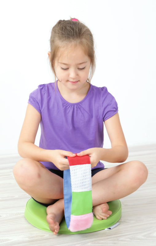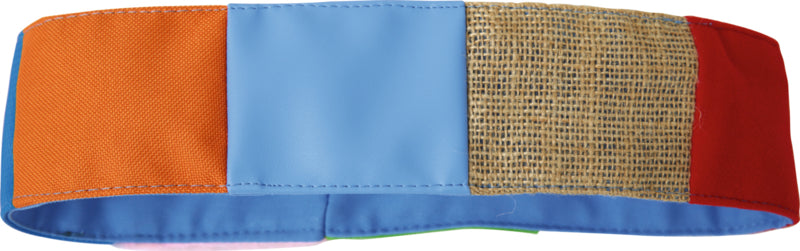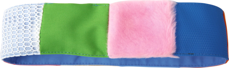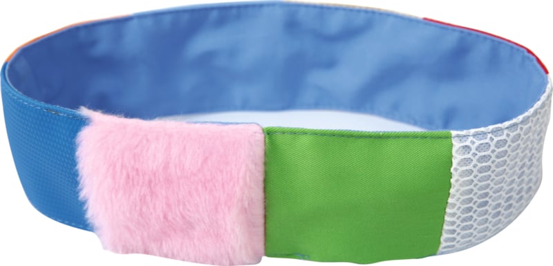 Hoofdband gemaakt van verschillende stoffen. Er zit een beweegbare bal in.