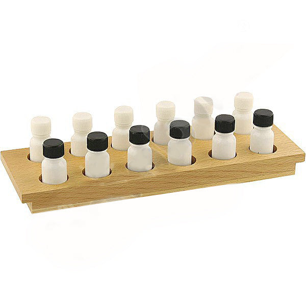 6 paar glazen geurflesjes op een houten houder.