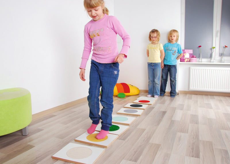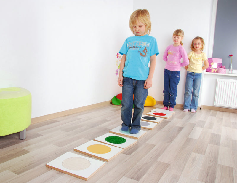 Set van 8 voetpaden van verschillende texturen die een stimulatie van receptoren bieden. Perfect voor revalidatie en motorische oefeningen. Gemaakt van hout.