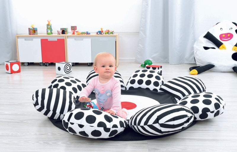 Zacht kussen met katoenen hoes. Contrasterende kleuren trekken de aandacht van jonge kinderen.