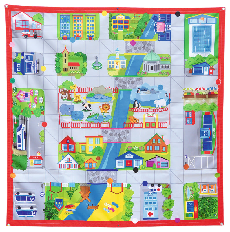 Speelbord met een kleine stad, met zijn instellingen: stadhuis, kerk, school, brandweer, politie en relax plaatsen zoals ijssalon, zwembad, strand, bioscoop, dierentuin, etc. De stad is verdeeld door verschillende wegen. Het spel helpt bij het leren van concepten zoals: boven, onder, links, rechts, terug, vooruit, enz. De grootte van het veld is aangepast aan de voeten van het kind.