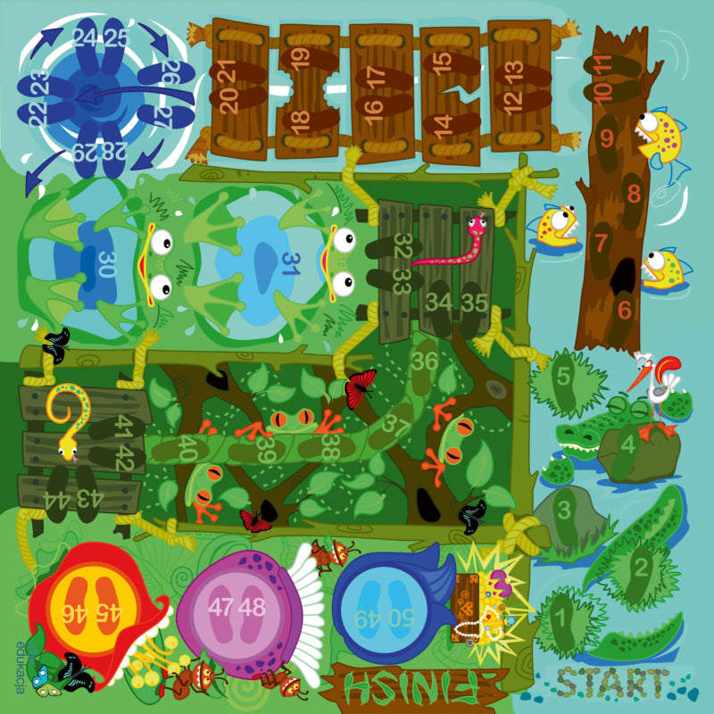 De afbeeldingen op dit spel moedigen kinderen aan om te spelen volgens de code op het bord. Springend van rechterbeen naar linkerbeen, op beide voeten, achteruit lopend, enz., Alle voetarrangementen zijn gemarkeerd op het bord. De taak van spelers is om het pad zo snel mogelijk correct te doorlopen.