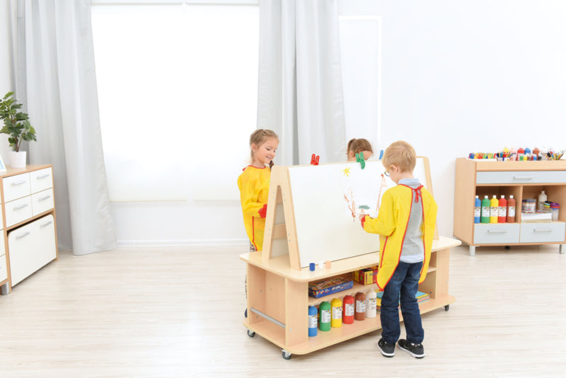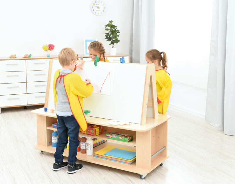 Met de dubbelzijdige ezel kunnen twee kinderen tegelijkertijd aan elke kant werken.