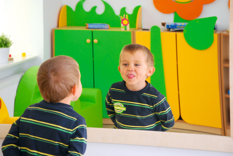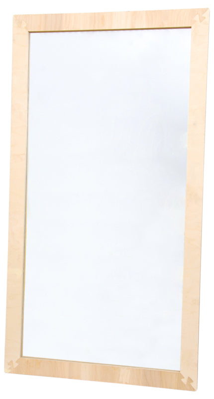 Grote, onbreekbare spiegel in een gelamineerd frame. Hiermee kan de leraar logopedie met het kind oefenen. Aan de muur te bevestigen met schroeven.