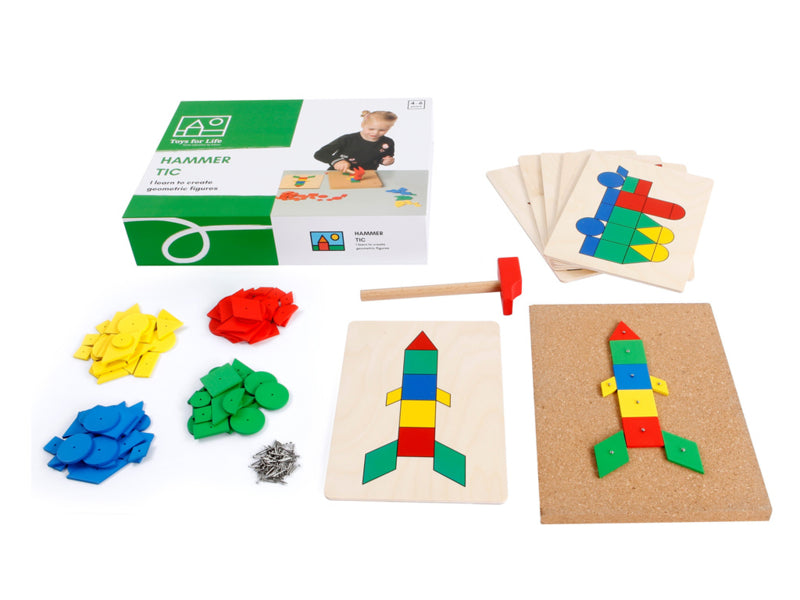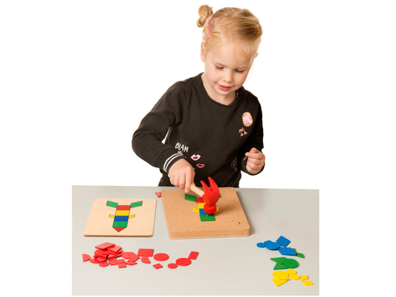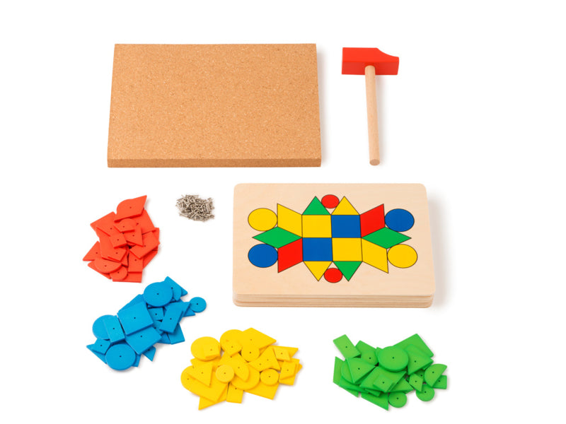 Inhoud: 1 bord, 6 taakkaarten aan beide zijden met 12 taken, 1 hamer, 108 spijkers, 108 figuren in 4 kleuren en 9 vormen, gebruiksaanwijzing.