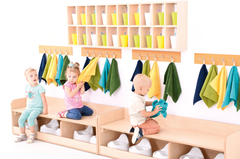 5 haken voor handdoeken. Kan worden gebruikt in de verschoonruimte, maar ook in de garderobe.