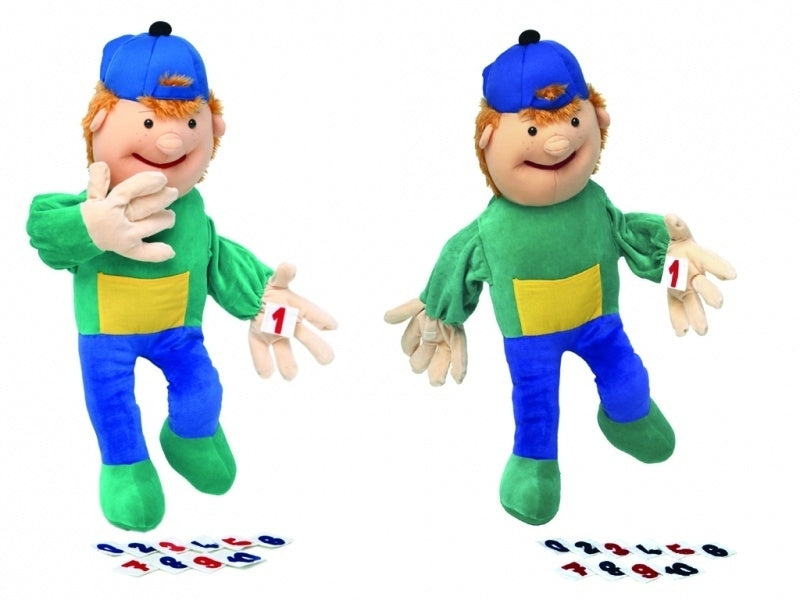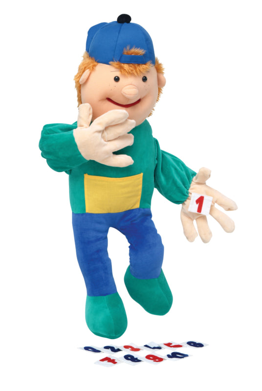 Handvertelpop Jake bewaart in zijn borstzakje de cijfers 0-10. Hij vindt het leuk om de kinderen te leren tellen.