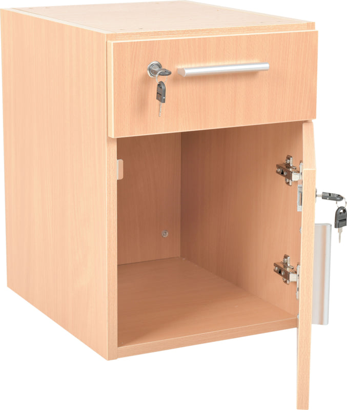 Hangcontainer, te monteren onder het bureau. Gemaakt van gelamineerd spaanplaat in een beuken kleur (dikte: 18 mm). Voorzien van lade met slot en kast met slot. Bevestigingsset is inbegrepen.