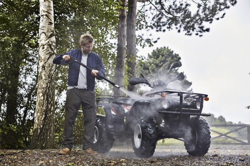 - Handige opbergmogelijkheid voor pistool, lans, en sproeier en voedingskabel.