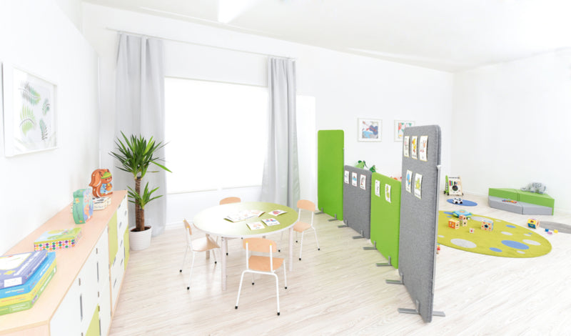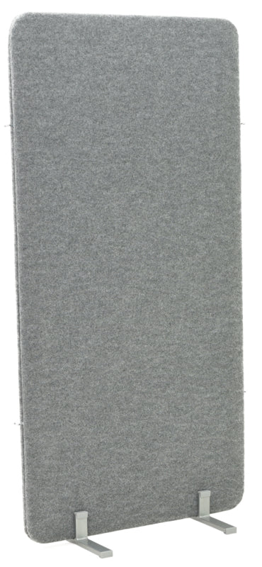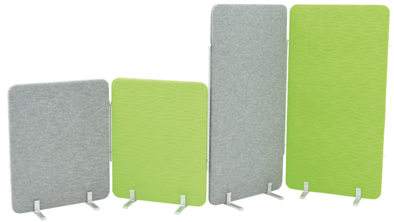 Geluiddempende schermen met een stijf frame bedekt met textiel, geplaatst op aluminium steunen. De mogelijkheid bestaat om meerdere schermen onder verschillende hoeken te combineren.