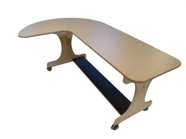Multifunctionele hoogzittafel in J-vorm. Door de ronding in de tafel kunnen er kinderstoelen aan de kopse kant gezet worden zonder dat deze ruimte van een bank innemen. Wanneer 2 J-tafels gecombineerd worden ontstaat er een ovalen vorm, of schuif de tafels iets uit elkaar zodat een leidster in het ontstane midden kan zitten.
