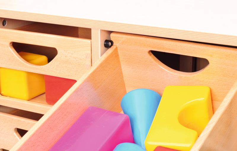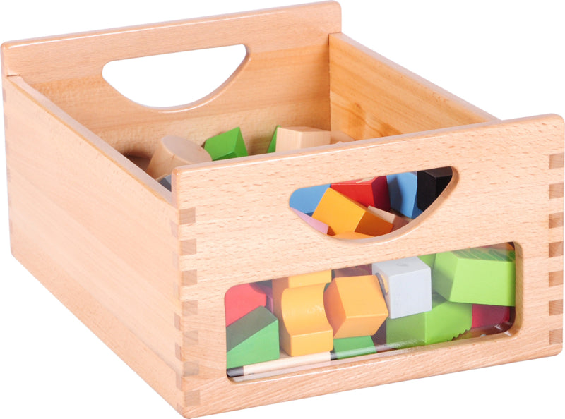 Esthetisch gemaakte houten kist met venster, voor het opbergen van blokken, klein speelgoed of accessoires.