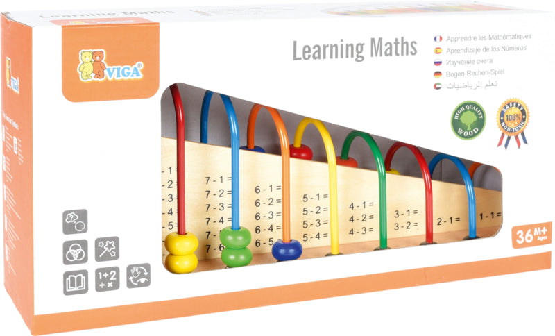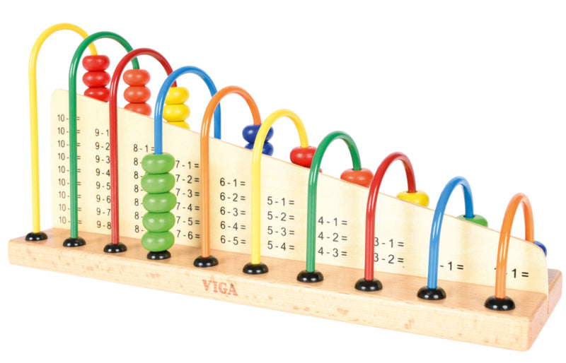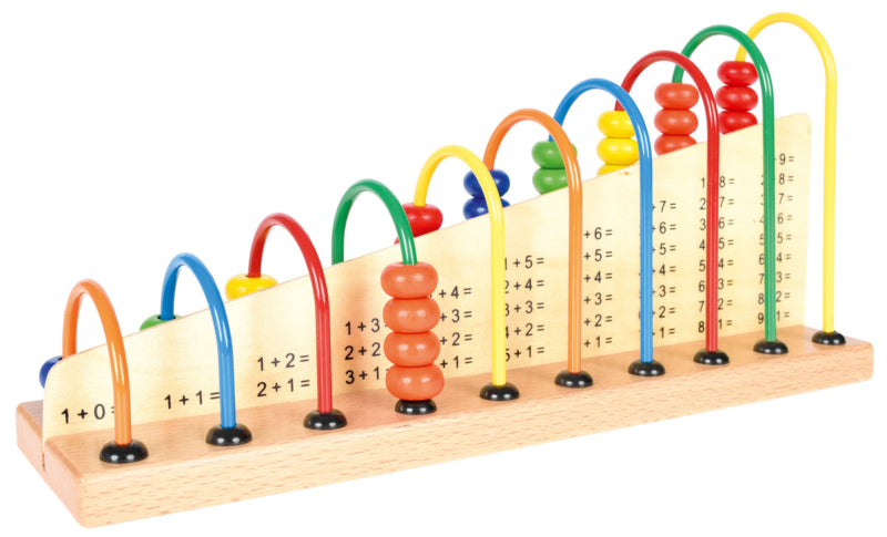 Dit dubbelzijdig telraam helpt bij het leren optellen en aftrekken in het bereik van 1 tot 10. Basis en kralen van hout, staven van metaal.