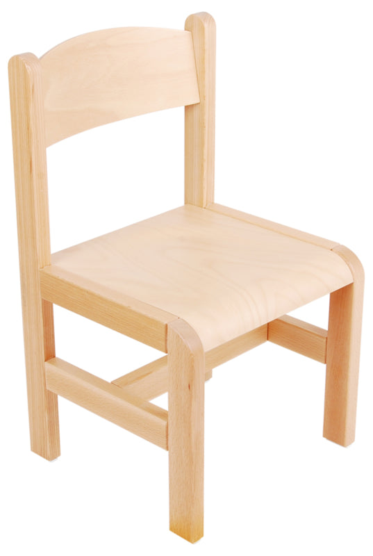 Houten stoel met comfortabele licht afgeronde rugleuning die de juiste houding ondersteunt.