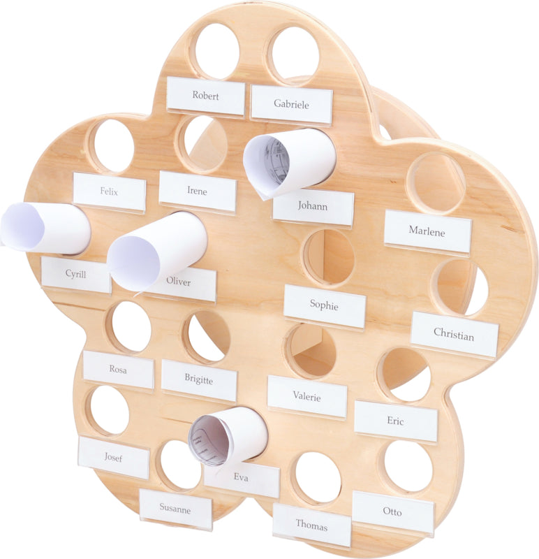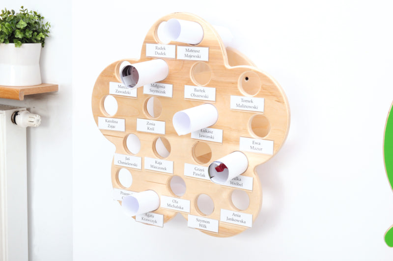 Panelen gemaakt van multiplex om op een muur te monteren. Met gaten voor vellen papier met informatie voor ouders. Onder de gaten is er plaats voor kindernamen (ze kunnen in frames worden geplaatst 042001, apart verkocht).