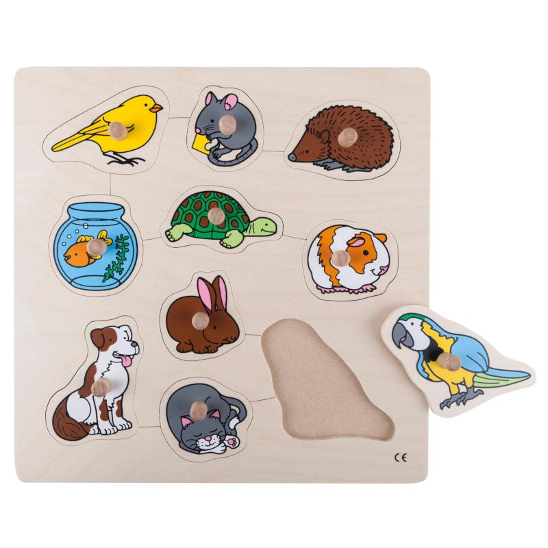 Door te spelen met deze inlegpuzzel leren kinderen verschillende huisdieren te benoemen. Deze inlegpuzzel stimuleert de visuele waarneming. Door de knoppen op de puzzelstukken zijn deze makkelijk vast te houden.