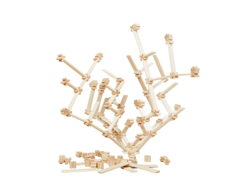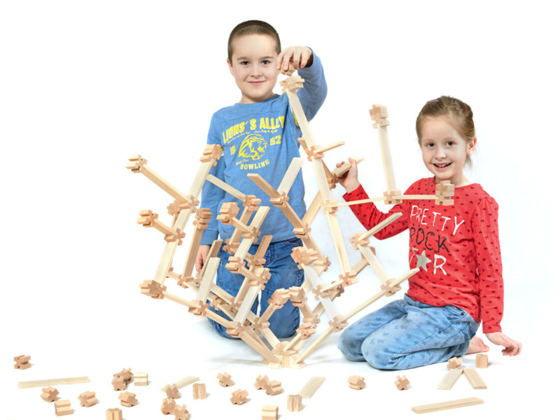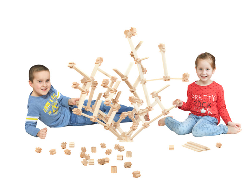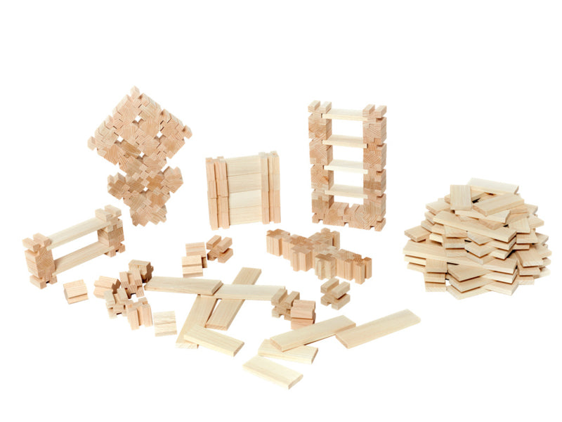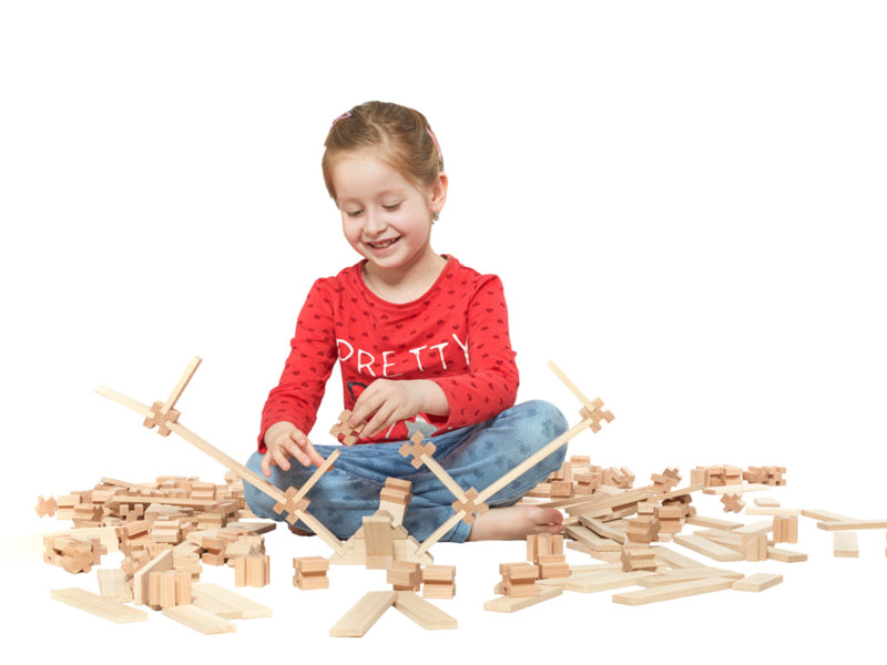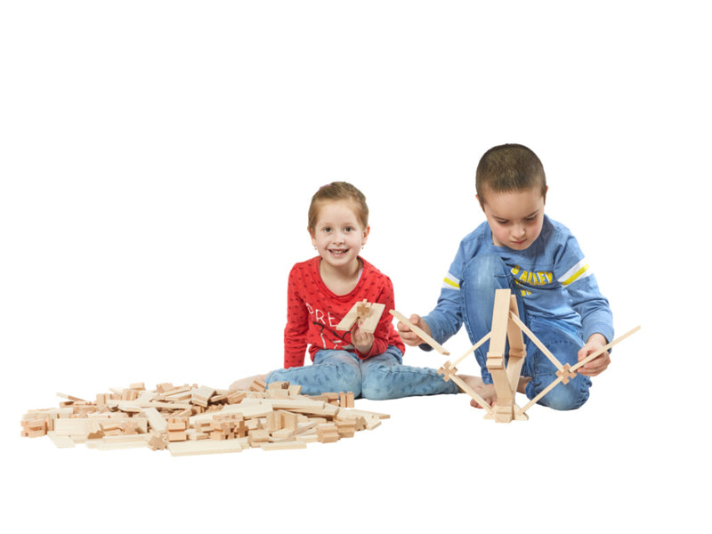 Uit drie verschillende houten vormen kunnen kinderen de meest fantasierijke bouwsels samenstellen, stapelen of naar boven laten groeien. Bouwen is erg leuk en bevordert de concentratie, fijne motoriek, creativiteit en probleemoplossend bewustzijn.