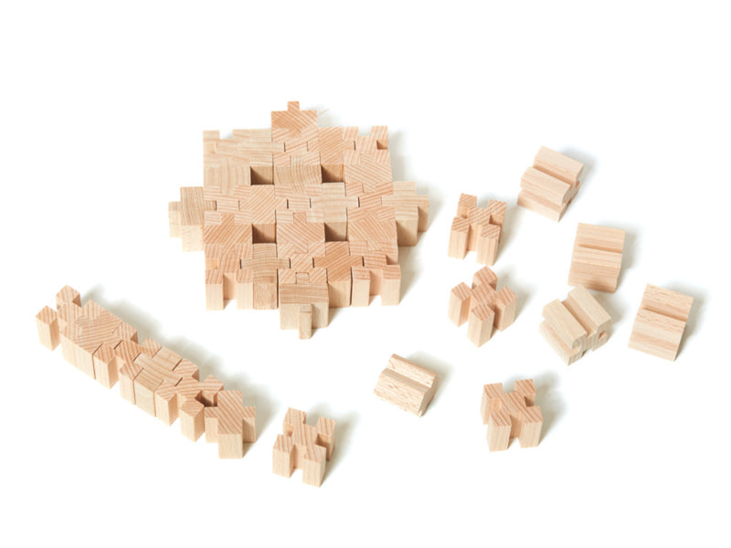Inhoud 40 x kubussen, 40 t kubussen, 20 planken elk in 7,5 / 12 / 16,5 cm lengte, 1 groot bord.