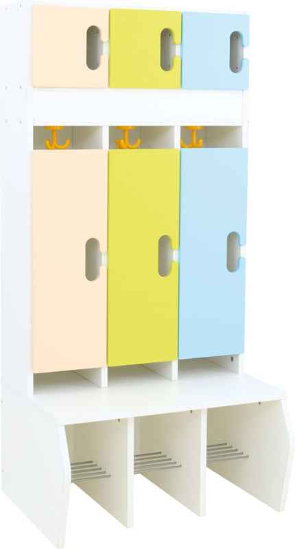 Garderobe voor 3 kinderen gemaakt van gelamineerd spaanplaat in een esdoorn kleur of wit. Metalen haken zijn inbegrepen.