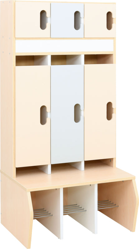 Garderobe voor 3 kinderen gemaakt van gelamineerd spaanplaat in een esdoorn kleur of wit. Metalen haken zijn inbegrepen.